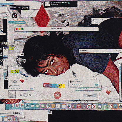 In her textile practice, Wood brings together traditional craft techniques and contemporary technology. Her own image acts as a point of departure for works that explore racial, sexual and gender identity as they relate to the Black femme body. Woods’ tapestries combine cybernetic and analog processes; in her work, a pixel is equivalent to a stitch, each stitch an analogy for the past, present and future of Black femmehood, both on- and off-line, pre- and post-internet.
