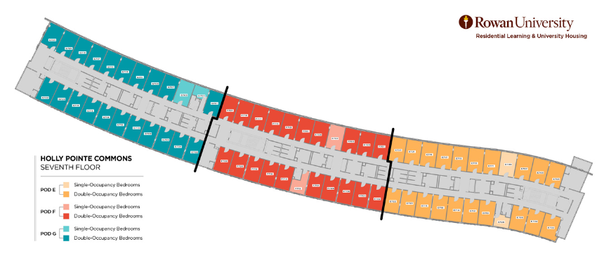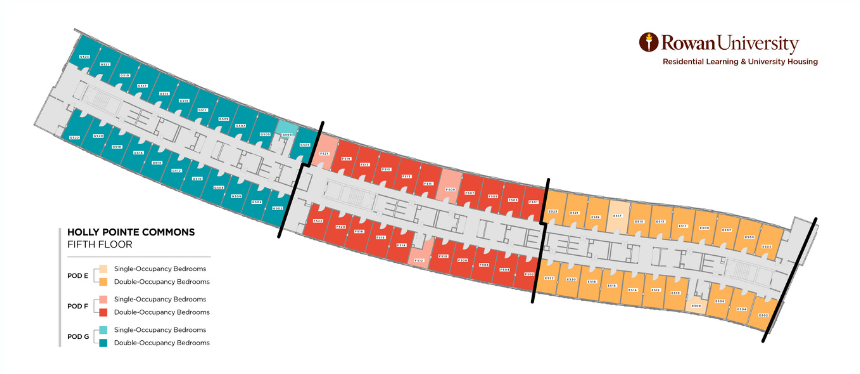 The building is designed into pods. Every pod forms a community with a Community Assistant (CA). Pods include a mix of student bedrooms, lounge and study spaces, bathrooms, and laundry rooms. Holly Pointe features air conditioning throughout, spacious double rooms primarily with a limited number of single bedrooms, card access entry to the building and bedrooms, and WiFi and Digital cable TV. This building was designed to provide options for gender-inclusive housing in a residence hall environment where students may choose roommates without restrictions based on gender. It also houses numerous Living-Learning Communities (Honors, Engineering, LGBTQIA+, Business, Writing Arts) where students can live with those who share interests, passions, and academic goals.