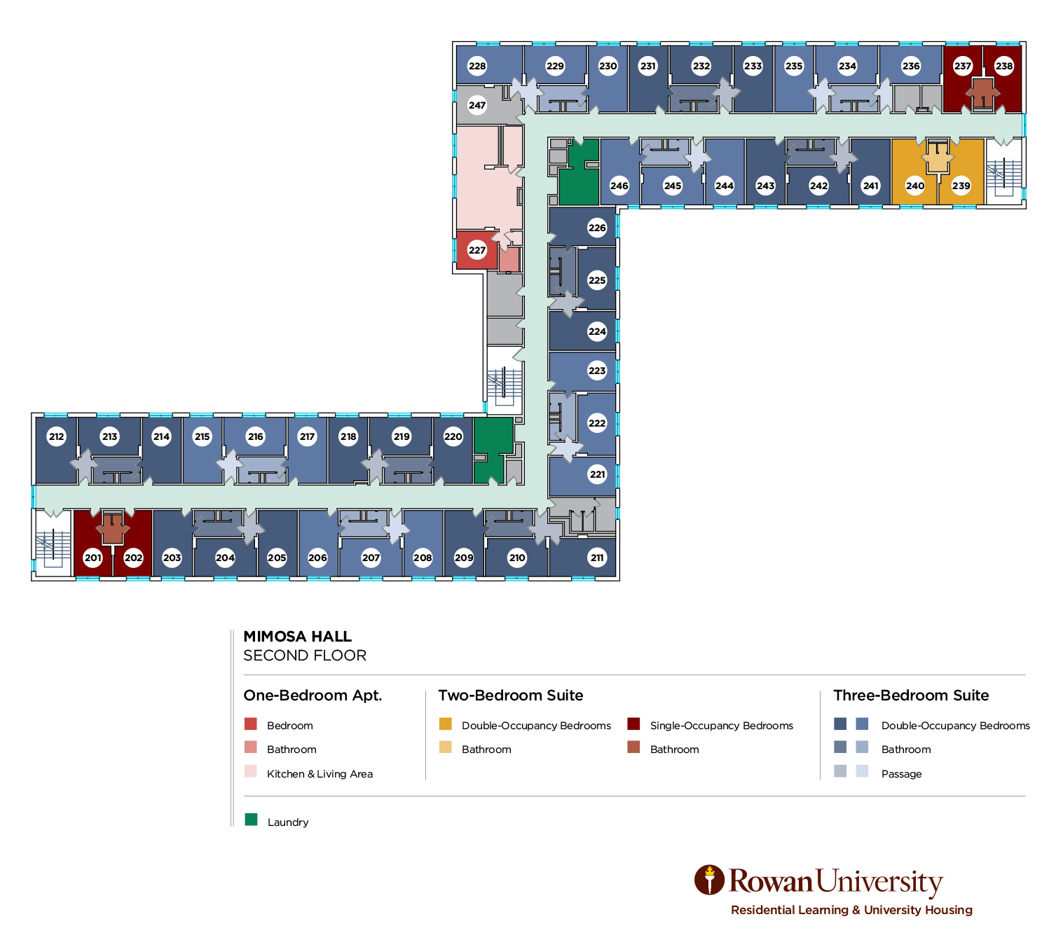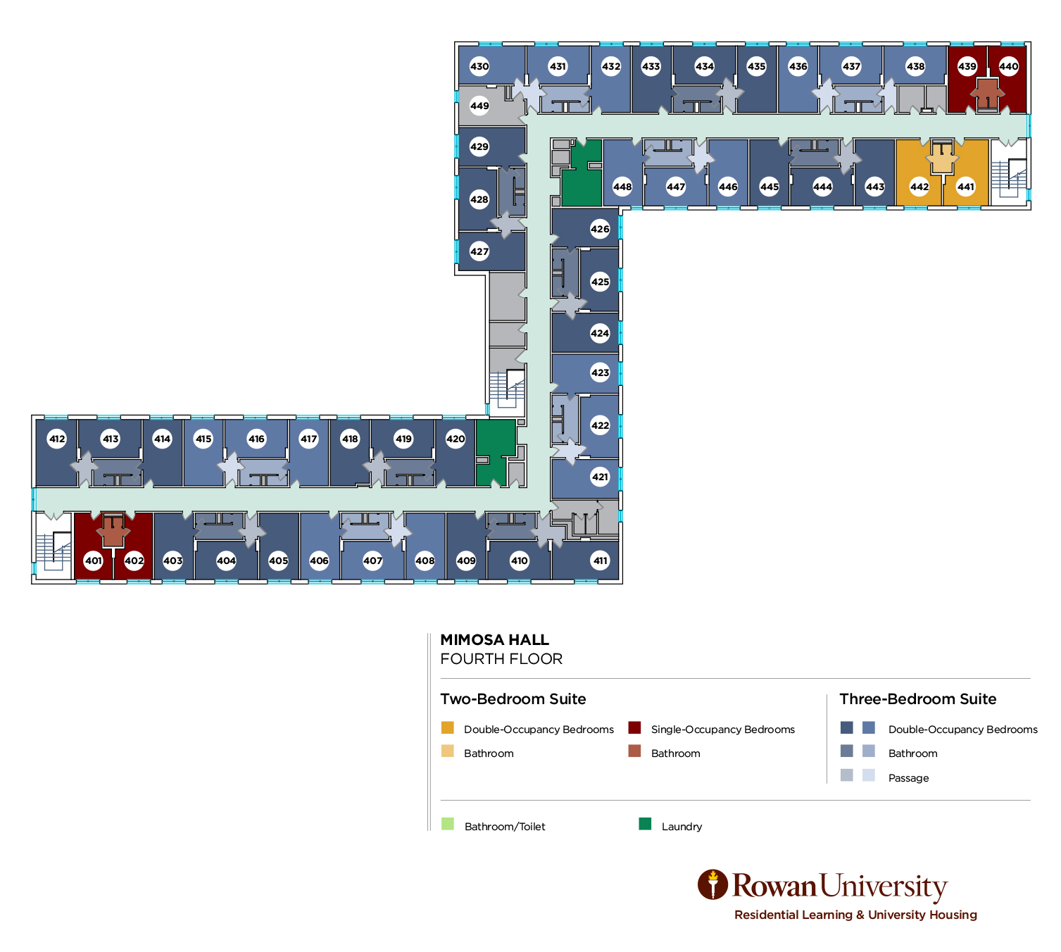 - Mimosa Hall is arranged into 4 floors of suites, assigned by gender. Each suite has two to three bedrooms joined by a common bathroom.
