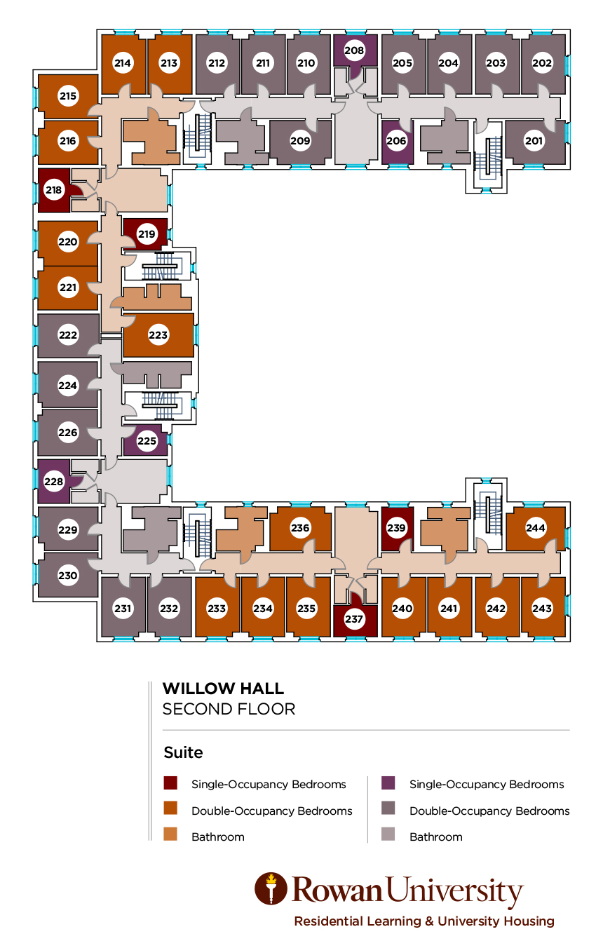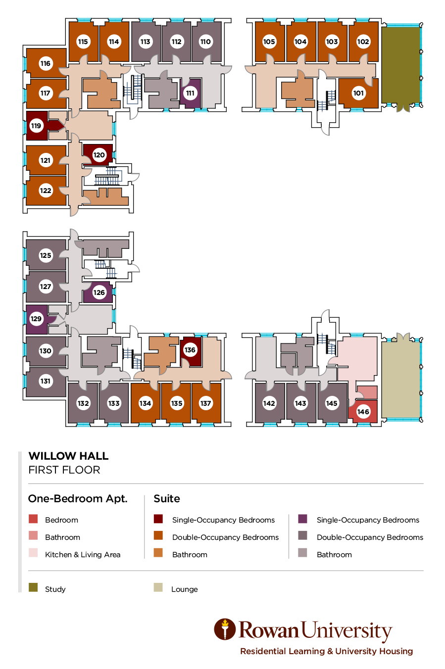 - Willow Hall has single and double-occupancy rooms located throughout the building, with the majority of the rooms assigned as doubles.