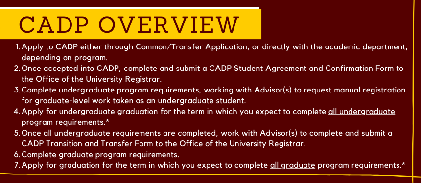 If an ADD student is not admitted to the graduate portion of their ADD for any reason or does not wish to continue in the program, the student should work with their advisor(s) to develop a plan of action and request that the University Registrar update the student’s record to reflect an appropriate non-ADD program. Depending on their program, they may be able to apply the graduate coursework taken as an undergraduate student toward a graduate certificate.*Not every ADD leads to two degrees and not every ADD allows 12 credits to double-count toward both the undergraduate and graduate transcripts. Additionally, some ADDs follow different degree awarding timelines and tuition models. Please refer to the academic department(s) which houses your particular ADD to discuss program requirements and benefits.